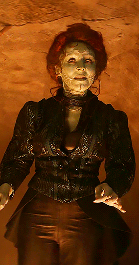 •skin: pale when appearing human. otherwise, green with ridged, swirling patterns across the high points of her face (see image).
